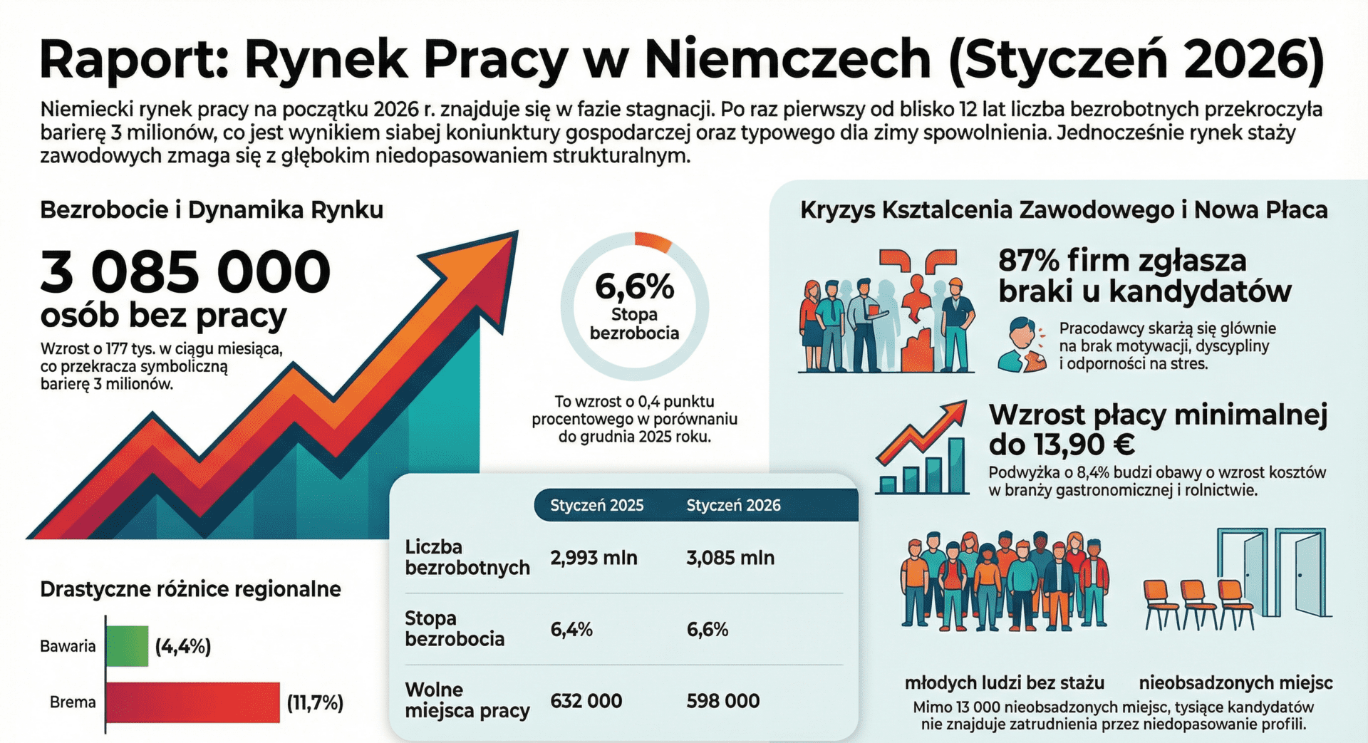 Początek 2026 roku przyniósł wyraźne pogorszenie sytuacji na niemieckim rynku pracy ❄️. Jak poinformowała Andrea Nahles, przewodnicząca Federalnej Agencji Pracy (BA), dynamika zatrudnienia pozostaje niska, a sezon zimowy – jak co roku – wpłynął na wzrost liczby osób bez pracy. Bezrobocie ponownie przekroczyło granicę 3 milionów.